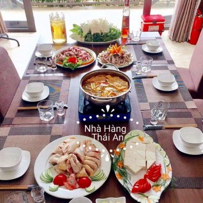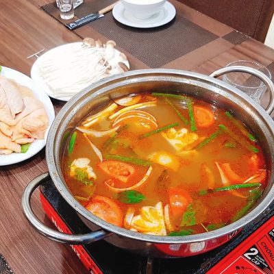 Lẩu thập cẩm gồm : gà. thịt bò, sụn, dạ dày…..ăn kèm mì trắng, rau lẩu